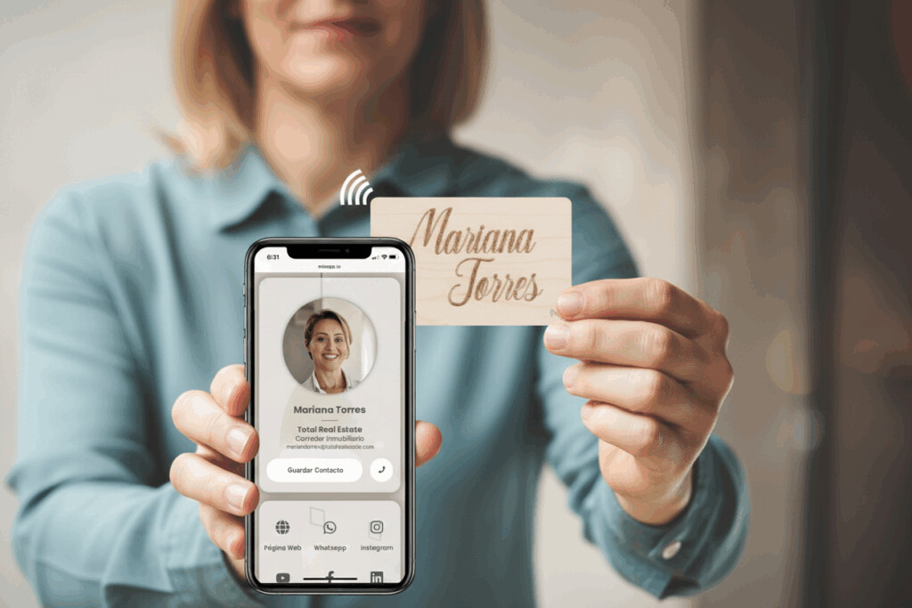 Las tarjetas NFC usan un chip que te permite compartir tu perfil tocando la tarjeta con el smartphone de otra persona. No se necesita app.